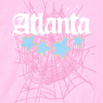 This hoodie features the iconic “Atlanta” gothic text across the chest layered over a spider-web graphic, with four star elements placed beneath the lettering. The design uses contrasting colors that highlight the graphics against the soft pink base, making the hoodie a standout piece in modern streetwear fashion.