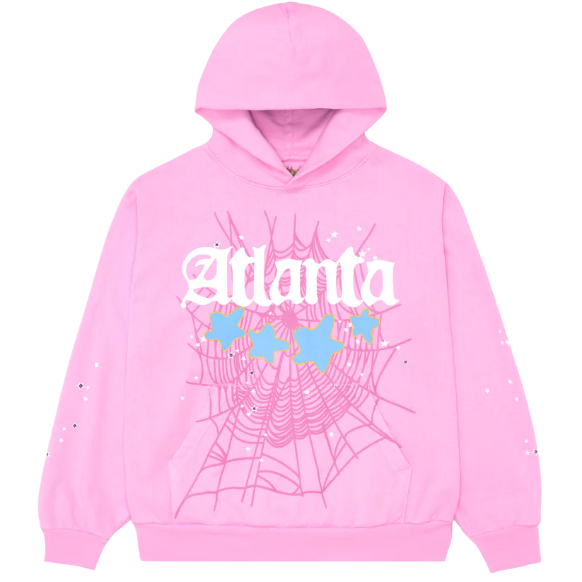 The Sp5der Atlanta Hoodie Pink is a streetwear hoodie featuring gothic “Atlanta” lettering, star graphics, and a spider-web design across the chest.