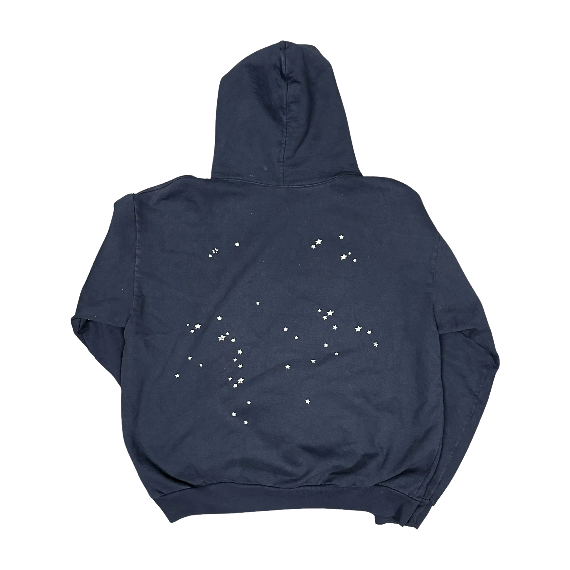 The Sp5der Atlanta Navy Hoodie is a streetwear pullover hoodie featuring Atlanta script lettering, star graphics, and a navy colorway.